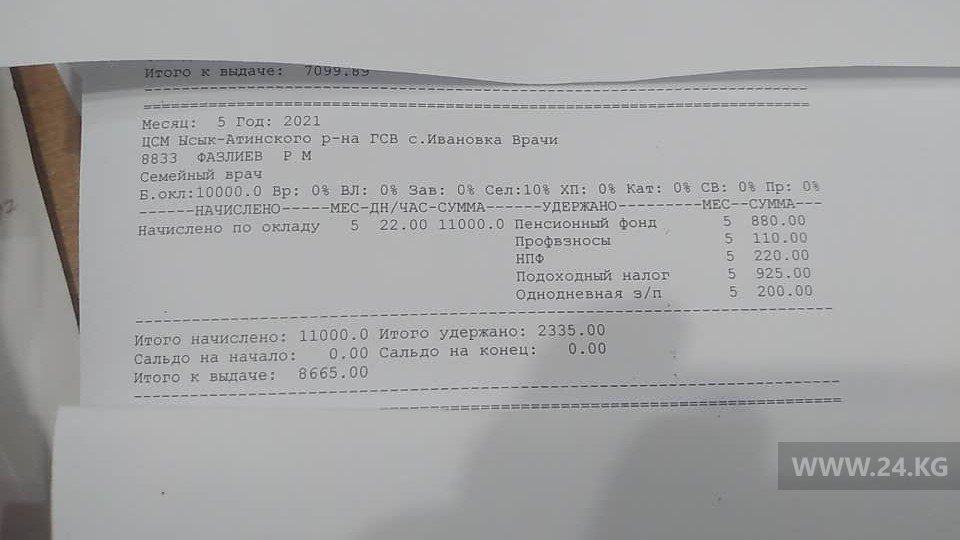 Больше вопросов у пользователей соцсетей вызвал квиток врача Н.Халова, согласно которому удержано 3 тысячи 950 сомов, а к выдаче — 4,3 тысячи сомов.