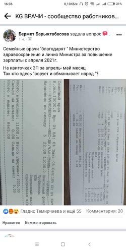 Семейные врачи в Чуйской области жалуются на новую зарплату, начисляемую с апреля 2021 года. Квитки с начислением выложила в соцсеть Facebook Бермет Барыктабасова.