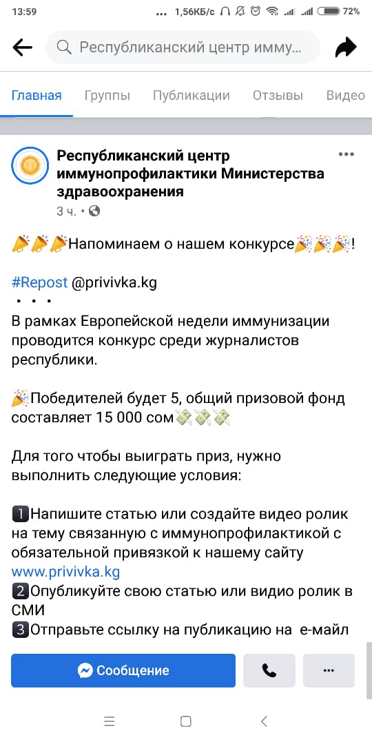 При этом на своей странице в Facebook центр сообщает о конкурсе на создание статей или видеороликов с привязкой к сайту www.privivka.kg. Когда работа возобновится, не уточняется.