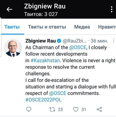 Председатель ОБСЕ Збигнев Рау призвал прекратить насилие в Казахстане. Об этом он написал в своем Twitter.