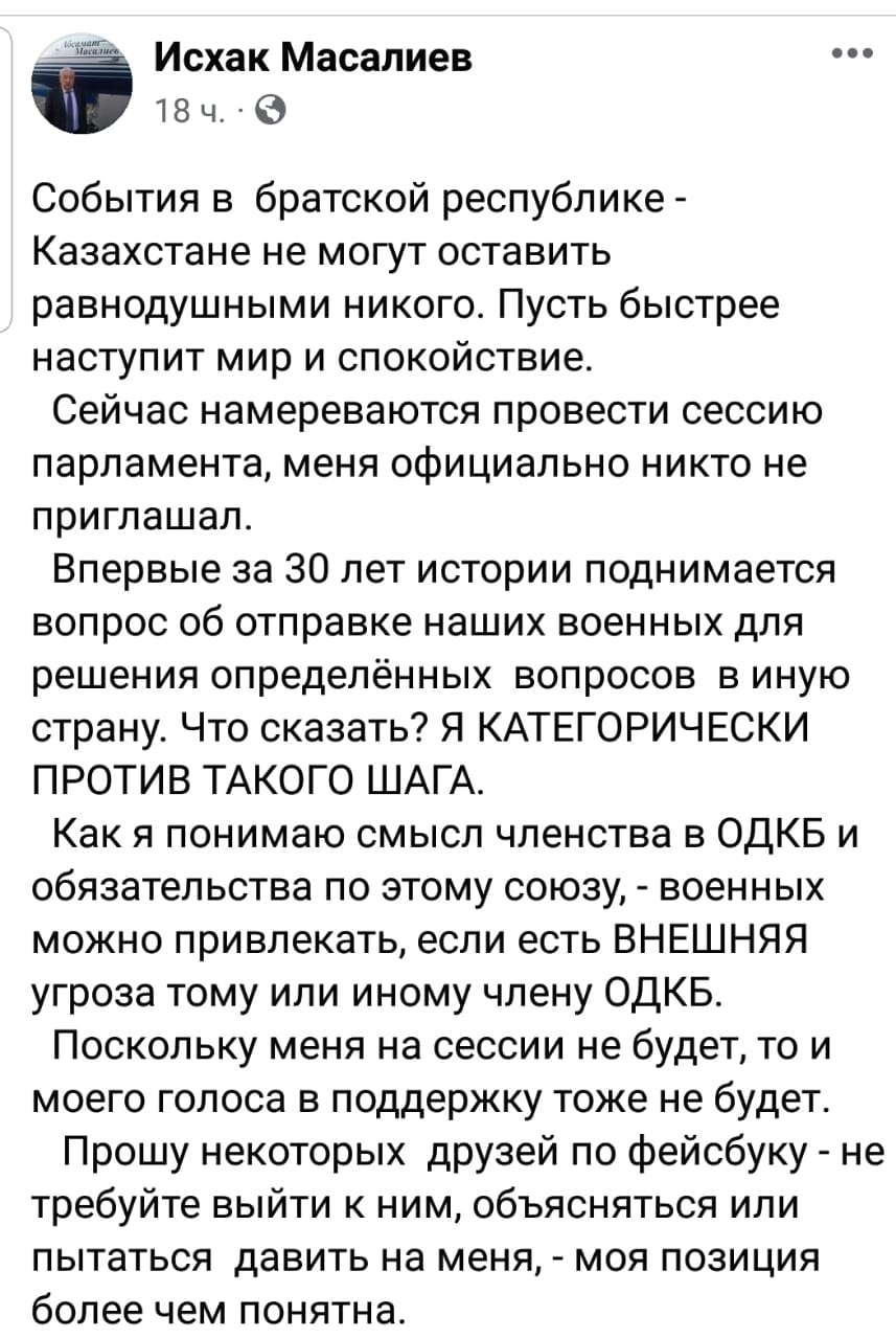 Депутат парламента Кыргызстана Исхак Масалиев заявил, что он против вмешательства ОДКБ, тем более с участием в этой миссии спецподразделений КР.