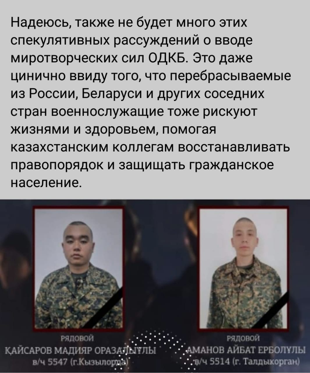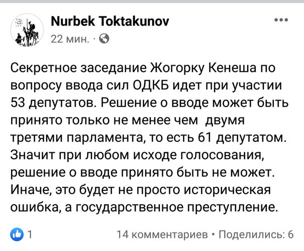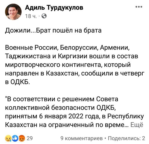 «Дожили... брат пошел на брата», — отреагировал на ввод сил ОДКБ в Казахстан блогер Адиль Турдукулов.