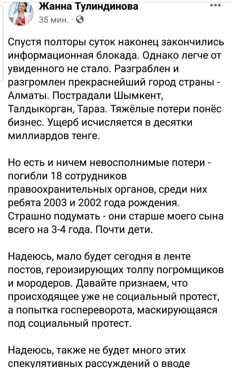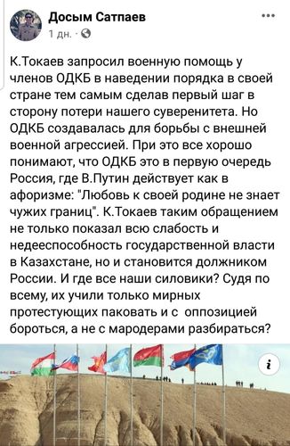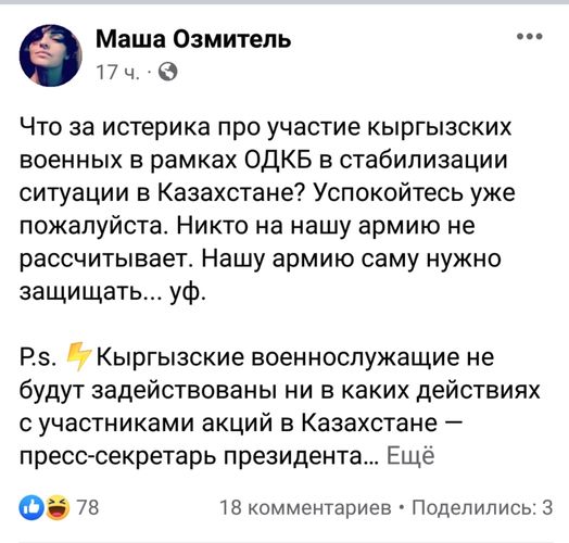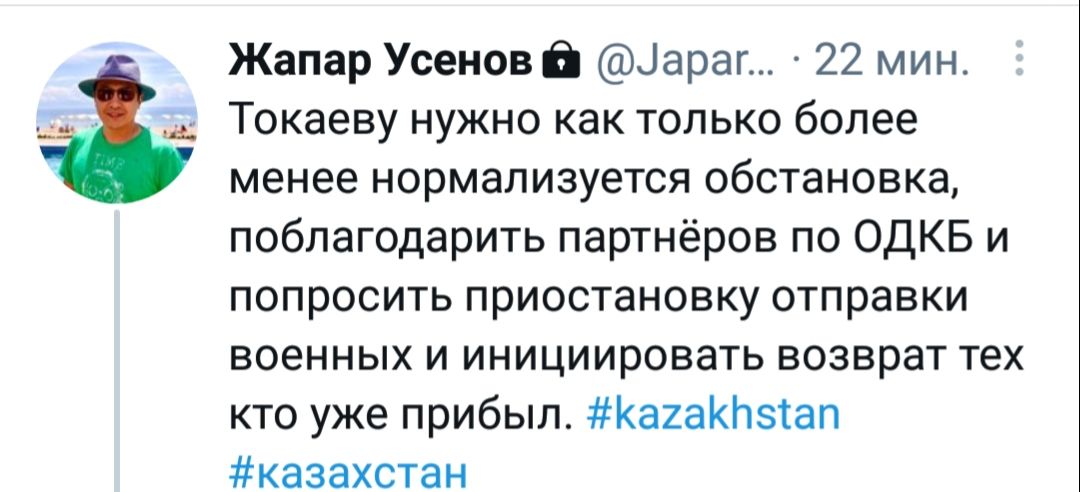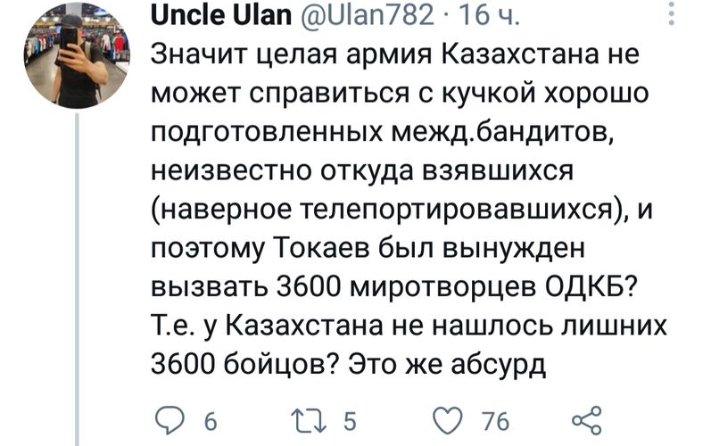 «Значит, целая армия Казахстана не смогла справиться с кучкой хорошо подготовленных международных бандитов? Зачем приглашать ОДКБ?» — задается вопросом пользователь Uncle Ulan.