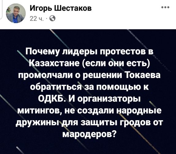 Эксперт из Кыргызстана Игорь Шестаков недоумевает: почему лидеры протестов в Казахстане (если таковые имеются) промолчали о решении властей обратиться за помощью к ОДКБ.