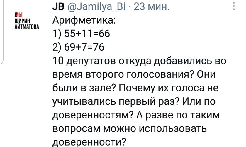 Не менее бурную реакцию в кыргызском сегменте вызвало и сегодняшнее решение Жогорку Кенеша об участии спецподразделений КР в миротворческой операции в составе сил ОДКБ. Пользователей интересовало, как получилось, что из присутствующих на заседании 53 человек, прошедших регистрацию, за со второй попытки проголосовали 69. Напомним, для принятия решения нужен был 61 голос.