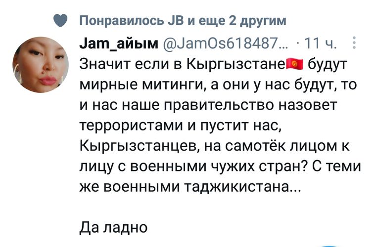 Одна из пользователей соцсетей спрашивает, привлекут ли власти Кыргызстана для подавления мирных митингов также миротворцев ОДКБ.