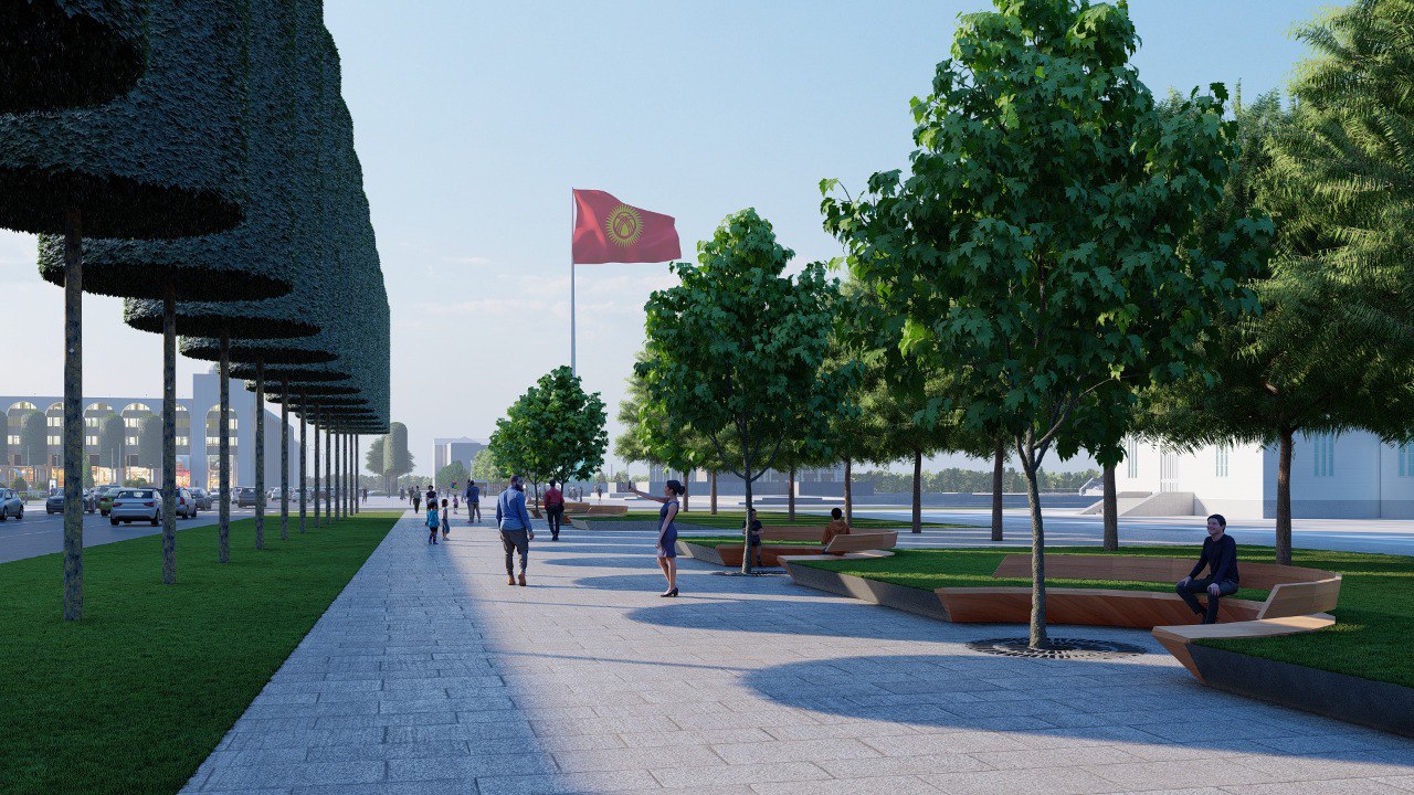 С двух сторон площади, на месте нынешних автостоянок, предлагается посадить деревья, сделать тенистые аллеи с удобствами в виде скамеек, беседок и так далее. «При этом можно сделать на площади и подземные стоянки для автомобилей», — пояснили в ГУ «Бишкекглавархитектура».