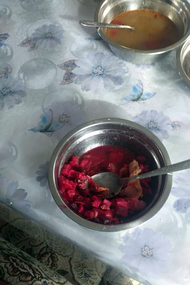 На момент посещения в интернате был обеденный перерыв. Представители акыйкатчи сразу обратили внимание на то, что детям второе блюдо и салат положили в одну посуду.