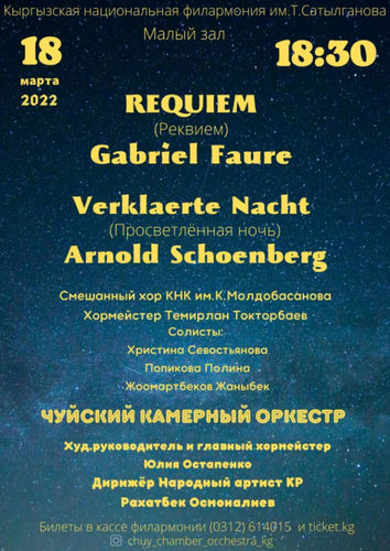 Впервые в Кыргызстане прозвучит «Реквием » Габриэля Форе с участием смешанного хора Кыргызской национальной консерватории. Худруководитель и главный хормейстер — Юлия Остапенко. Зрители услышат и «Просветленную ночь» Арнольда Шенберга в исполнении Чуйского камерного оркестра. Главный дирижер — народный артист КР Рахатбек Осмоналиев.