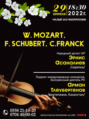Прозвучат произведения великих композиторов европейской музыки, таких как Вольфганг Амадей Моцарт, Франц Шуберт, Сезар Франк. Участники — Народный артист Кыргызской Республики Эрнис Асаналиев (скрипка), а также приглашенный гость из Казахстана — Заслуженный деятель РК Арман Тлеубергенов (фортепиано).