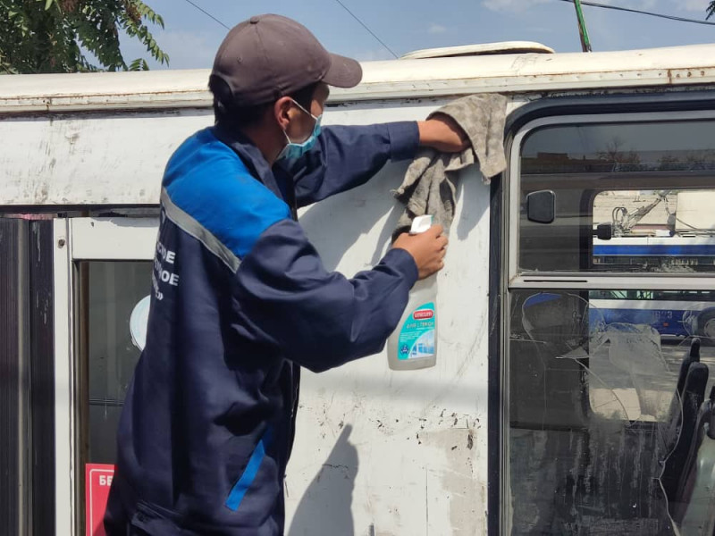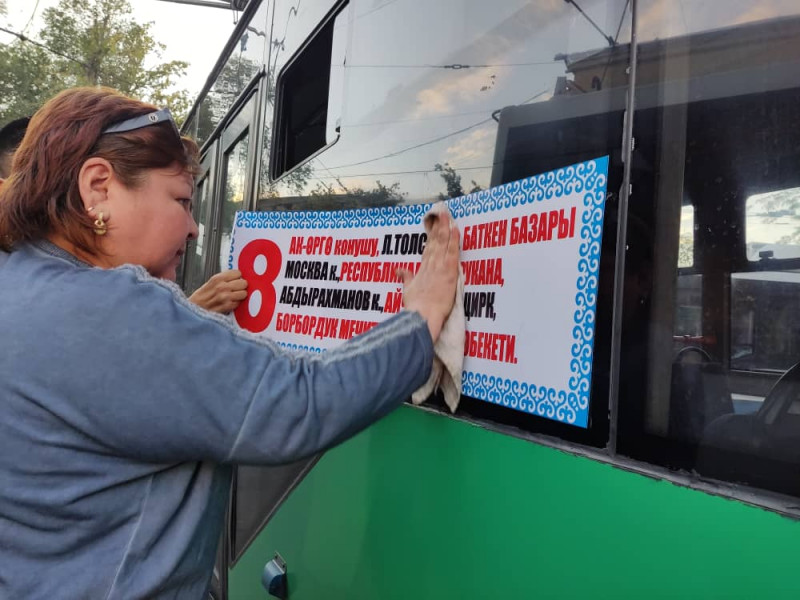 На сегодня надписи в троллейбусах полностью заменены на кыргызский язык и ведется работа по обновлению трафаретов.
