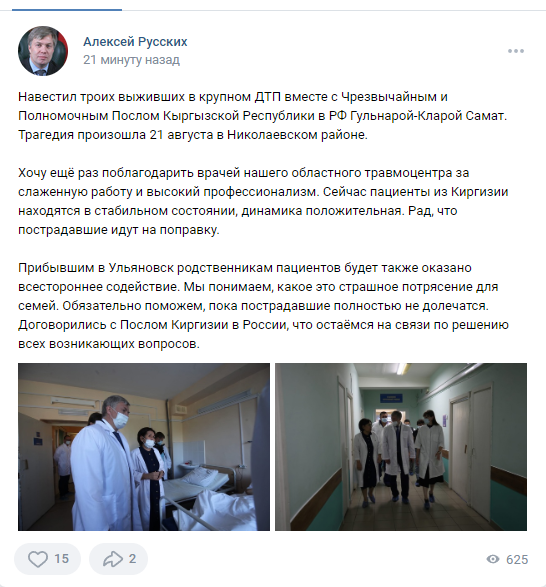 Губернатор Ульяновской области Алексей Русских и посол КР в РФ Гульнара-Клара Самат навестили кыргызстанцев, выживших в крупной аварии в России. Об этом российский чиновник сообщил на своей странице «ВКонтакте».