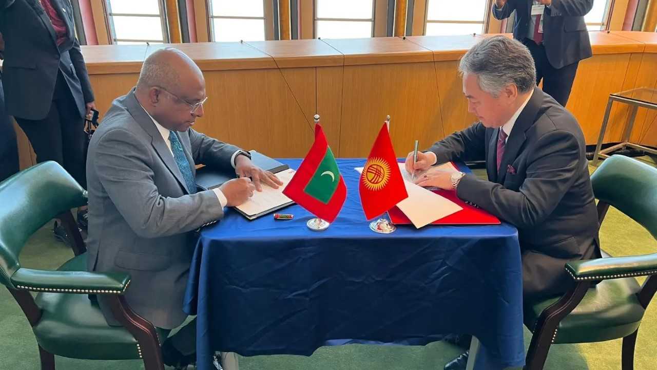 По ее данным, главы внешнеполитических ведомств провели вчера переговоры на полях 77-й сессии Генеральной ассамблеи ООН. Стороны подписали Соглашение между кабинетом министров Кыргызской Республики и правительством Мальдивской Республики о взаимном освобождении от визовых требований.