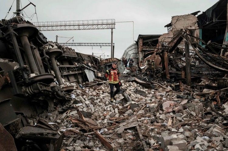 Фото Yasuyoshi Chiba/AFP/Scanpix/LETA. Пожарный идет по завалам на грузовой железнодорожной станции в Харькове