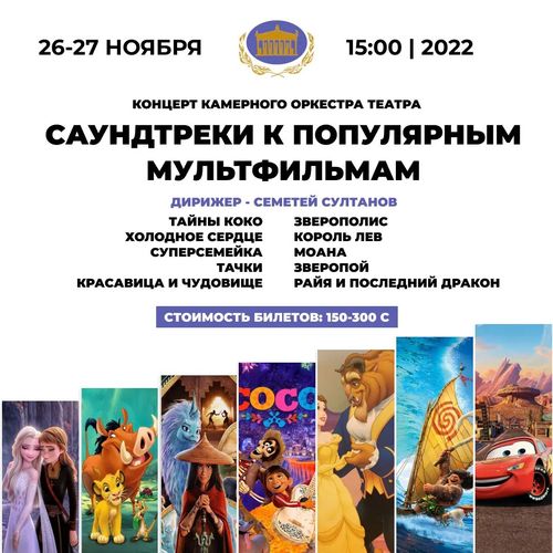 Камерный состав симфонического оркестра Кыргызского национального академического театра оперы и балета имени Абдыласа Малдыбаева приготовил сюрприз для своих юных слушателей. Прозвучат любимые саундтреки к популярным мультфильмам. Дирижер — Семетей Султанов.