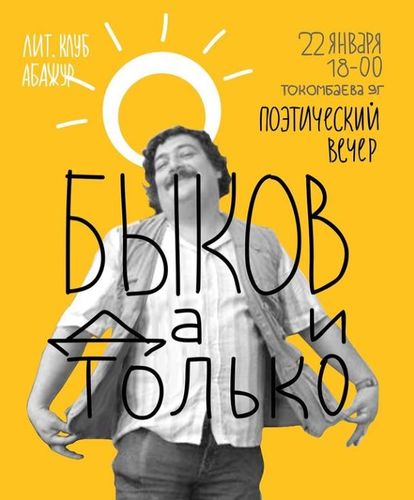 В поэтической программе «Быков да и только» литклуб «Абажур» постарается отразить разные грани поэтического таланта писателя, публициста, поэта Дмитрия Быкова. В перерывах между поэзией живая музыка. Регистрация по телефону 0550505122550.