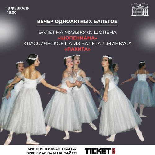Зрители увидят балеты на музыку Людовика Минкуса «Пахита», а также «Шопениана» по произведениям Фредерика Шопена. Дирижер — Урмат Тентимишов.