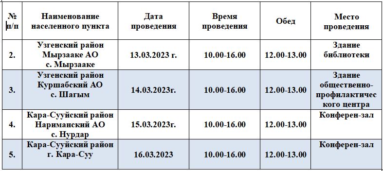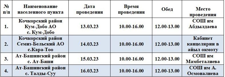 Мобильные группы из специалистов территориальных государственных органов и адвокатов службы юридической помощи при Минюсте сегодня, 13 марта, начали выезды в пилотные районы Ошской и Нарынской областей, а с 22 марта проект охватит Чуйскую область.