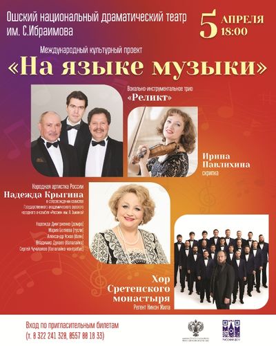 На одной сцене выступят трио «Реликт» и скрипачка Ирина Павлихина, квинтет солистов Государственного академического русского народного ансамбля «Россия» имени Людмилы Зыкиной и Народная артистка России Надежда Крыгина, а также мужской хора Сретенского монастыря. Пригласительные можно получить в Русском доме в Оше.