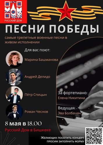 Выступят кыргызстанские исполнители, лауреаты международных конкурсов Марина Башманова, Роман Чеснов, Андрей Делидо и Петр Спицын. Прозвучат песни военных лет под аккомпанемент концертмейстера Елены Никитиной. Ведущая — Эва Болбачан. Регистрация по ссылке.