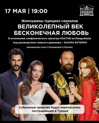 Симфонический оркестр театра оперы и балета под управлением главного дирижера Захара Бутенко подготовили программу из двух самых известных шедевров турецкой кинематографии «Кара Севда» и «Великолепный век». Все вырученные средства перечислят народу Турции, пострадавшему от землетрясений.