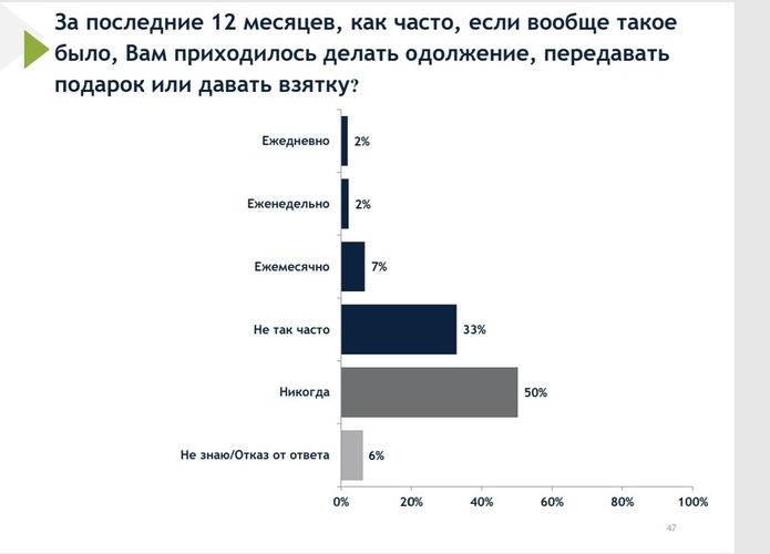 В Кыргызстане 50 процентов граждан в течение года ни разу не давали взяток, не преподносили подарков и никаким иным способом не выражали благодарность. Об этом говорится в итогах национального опроса Международного республиканского института.