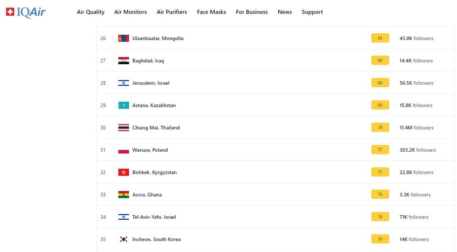 В рейтинге крупнейших городов мира по качеству воздуха World Air Quality на 18.00 столица расположилась на 32-м месте. Индекс качества воздуха — «умеренный» — 77 (AQI).