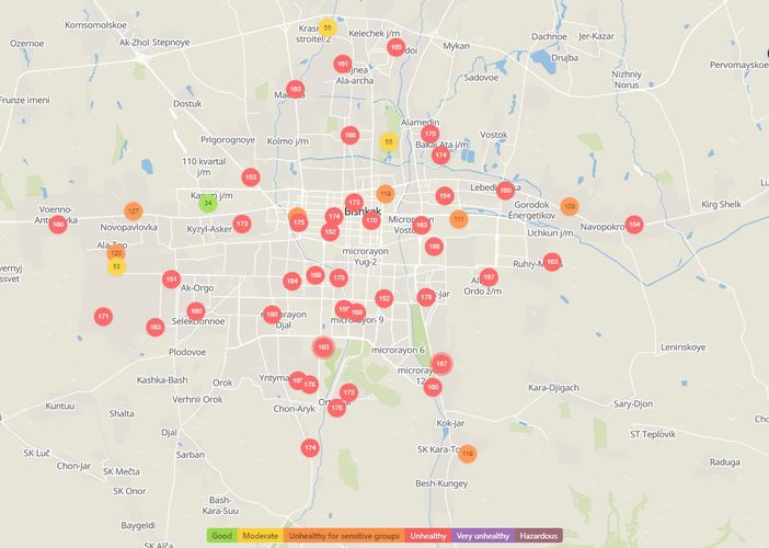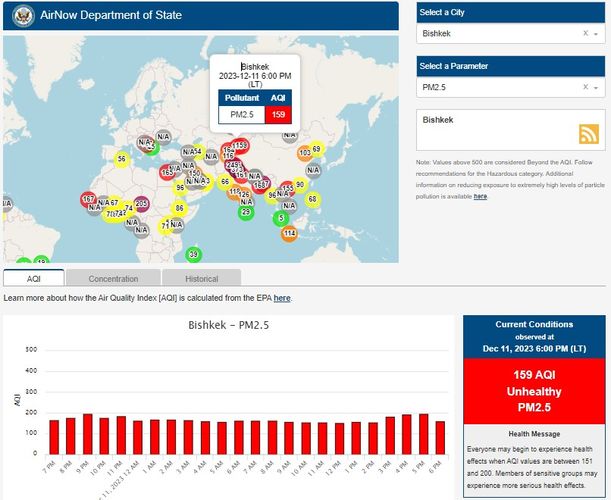 На территории посольства США в Кыргызстане также установлена станция. Информация обновляется каждый час. Индекс качества воздуха в районе дипломатической миссии «нездоровый» — 159 (AQI).