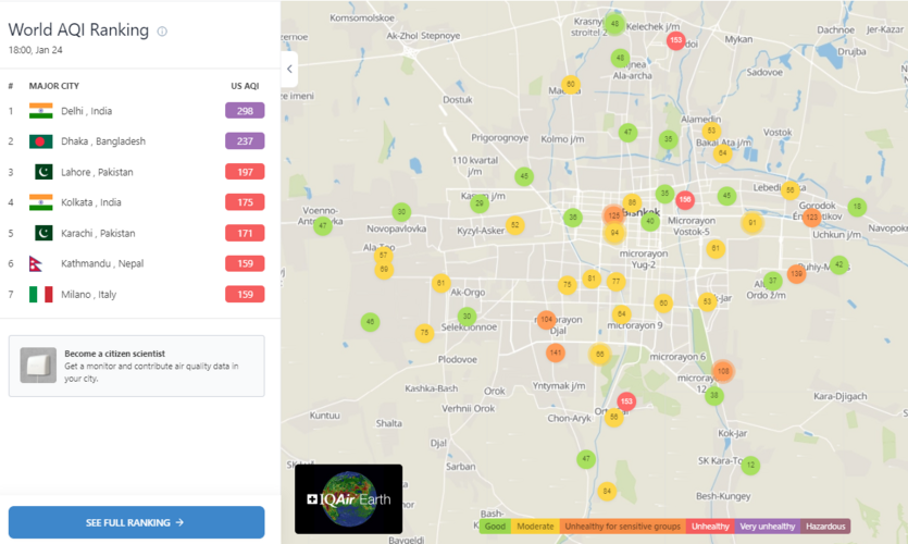 В рейтинге крупнейших городов мира по качеству воздуха World Air Quality Бишкек находится на 47-м месте.