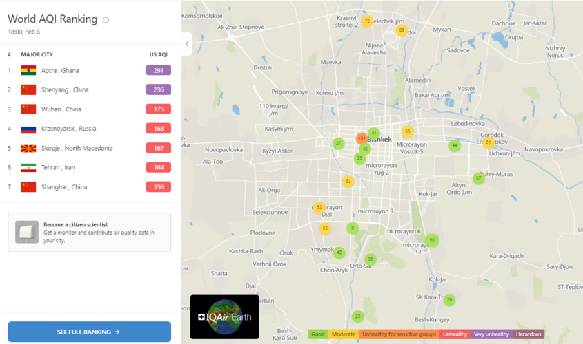 В рейтинге крупнейших городов мира по качеству воздуха World Air Quality Бишкек опустился на 67-е место.