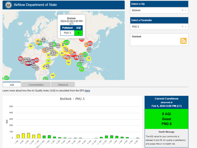 На территории посольства США в Кыргызстане также установлена станция. Каждый час информация обновляется. Индекс качества воздуха в районе дипломатической миссии «хороший» — 5 (AQI).