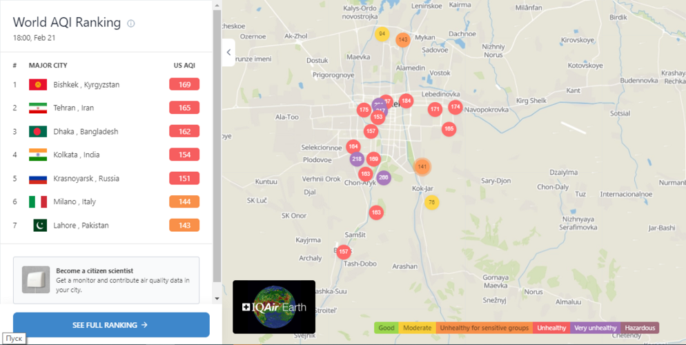 В рейтинге крупнейших городов мира по качеству воздуха World Air Quality Бишкек поднялся на 1-е место.