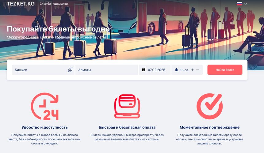 На сайте https://tezket.kg/ можно онлайн забронировать билет за 10 дней до отъезда в международных и междугородних автобусных направлениях, указав маршрут, дату отъезда и число пассажиров. После выбора маршрута необходимо заполнить анкету и оплатить проезд.