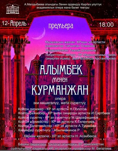 Музыка народного артиста КР Сатылгана Осмонова в редакции Таалайбека Дооронова на либретто поэтессы, заслуженного деятеля культуры КР Бубайши Арстанбековой. История любви, жизни и служения Отчизне великих кыргызских политических деятелей — Алымбека датки и Курманджан датки.