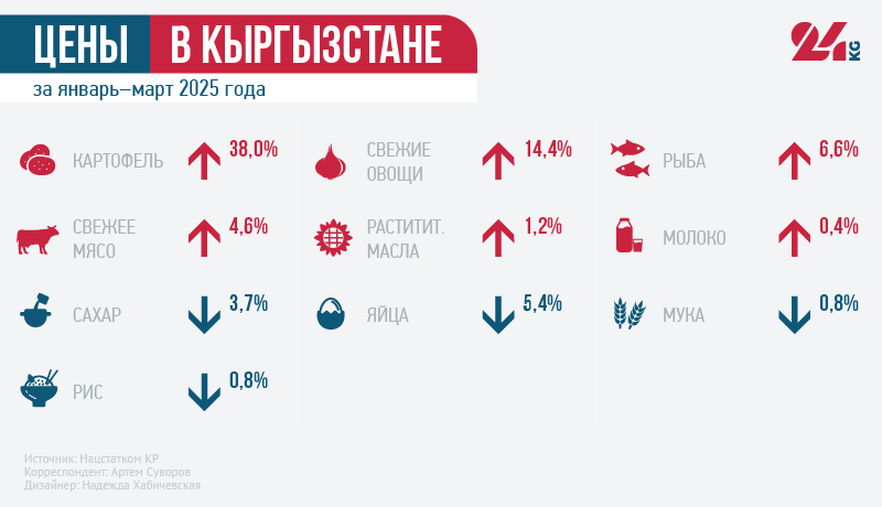 В январе — марте этого года по сравнению с декабрем 2024-го общий прирост потребительских цен в Кыргызстане составил 1,8 процента. Что подорожало и подешевело в первом квартале, читайте по ссылке.