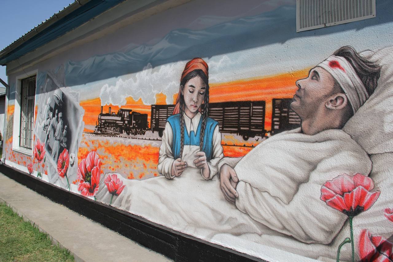 В Канте на фасаде средней школы № 5 размещен новый мурал, посвященный подвигу кыргызстанцев в годы Великой Отечественной войны. На стене изображена девушка-врач, оказывающая помощь раненому бойцу в условиях госпиталя.
