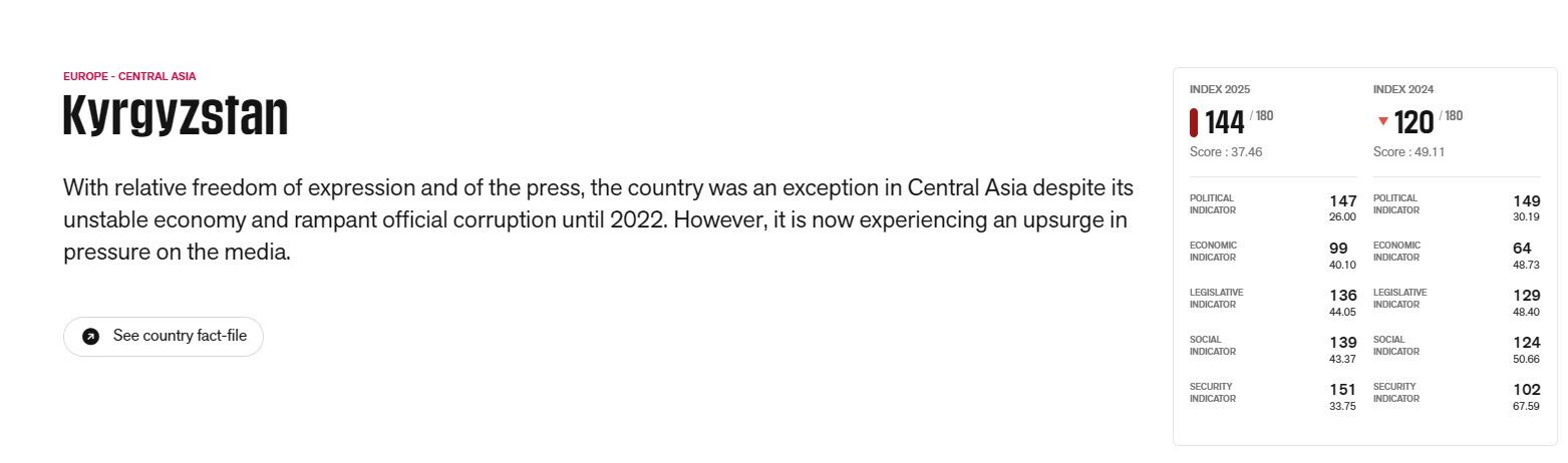 Кыргызстан занял 144-е место из 180 во Всемирном индексе свободы прессы — 2025, опубликованном международной организацией «Репортеры без границ» (RSF). Республика набрала 37,46 балла из 100 возможных, войдя в категорию стран с «очень серьезной ситуацией» в области свободы СМИ.
