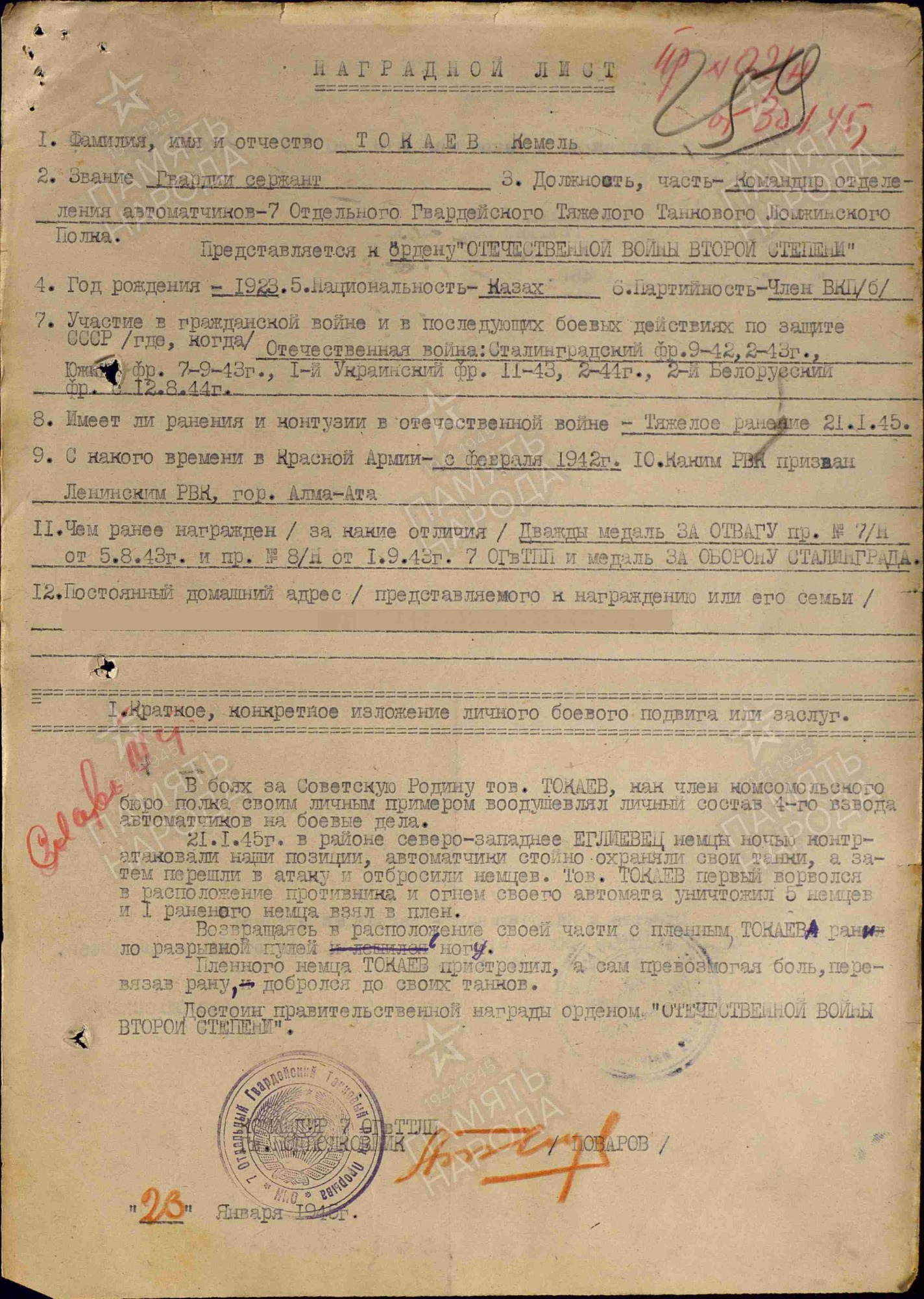 «В боях за Советскую Родину товарищ Токаев как член комсомольского бюро полка своим личным примером воодушевлял личный состав 4-го взвода славе автоматчиков на боевые дела. 21 января 1945-го в районе северо-западнее Еглиевец немцы ночью контратаковали наши позиции. Автоматчики стойко охраняли свои танки, а затем перешли в атаку и отбросили немцев. Товарищ Токаев первым ворвался в расположение противника и огнем своего автомата уничтожил пять немцев, одного раненого немца взял в плен. Возвращаясь в расположение своей части с пленным, Токаева ранило разрывной пулей в ногу. Пленного немца Токаев пристрелил, а сам, превозмогая боль, перевязав рану, добрался до своих танков», — подчеркивается в наградном листе.