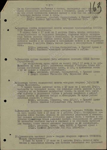 «За весь период боев, с 17 июля по 1 августа 1943-го, беспрерывно находился около танков, охраняя их, действовал решительно и отважно. Под сильным артиллерийским обстрелом держал связь с танками и под ружейно-пулеметным огнем выполнял приказы командования по разведке состояния подбитых танков и экипажей и по отысканию проходов для танков. Огнем своего автомата уничтожил до 20 гитлеровцев», — говорится в документе.