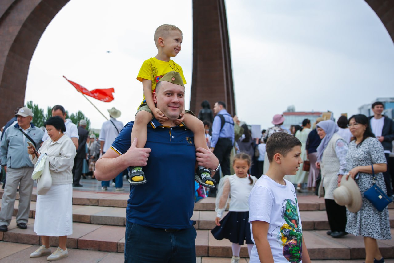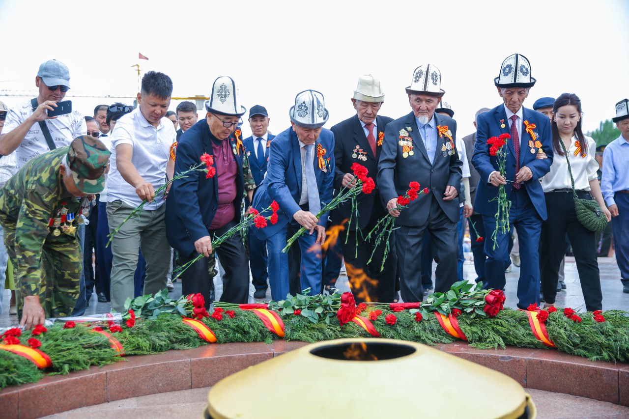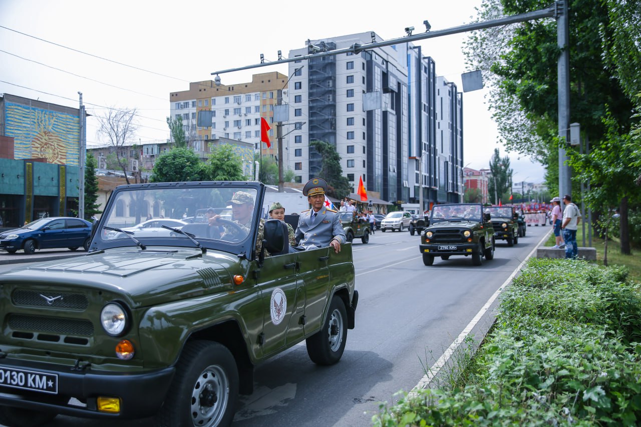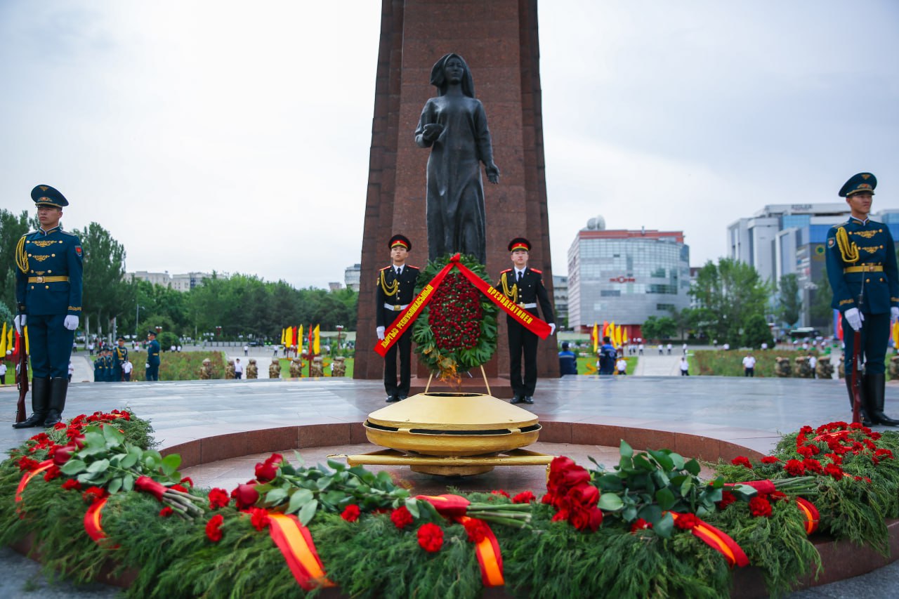На Площади Победы их ожидали другие горожане и гости столицы. Там ветераны, мэр столицы и депутаты Бишкекского городского кенеша возложили цветы к Вечному огню. После гостей ожидала выставка военной техники и традиционная солдатская каша.
