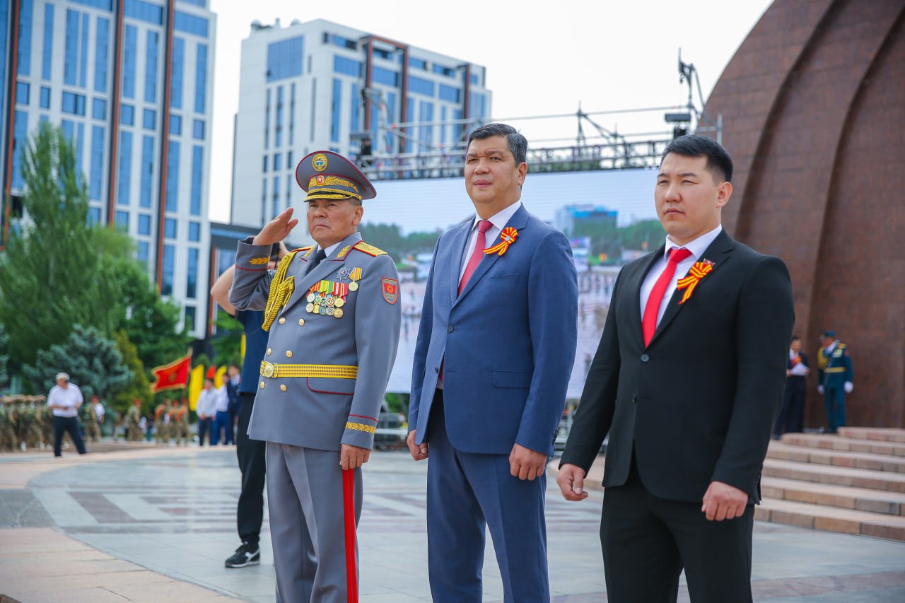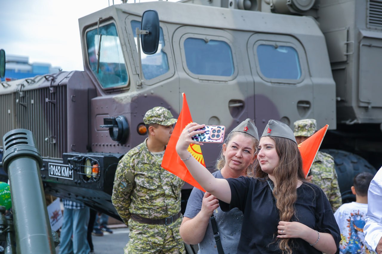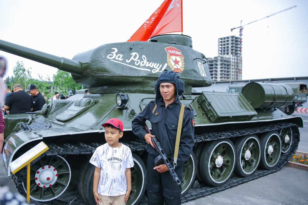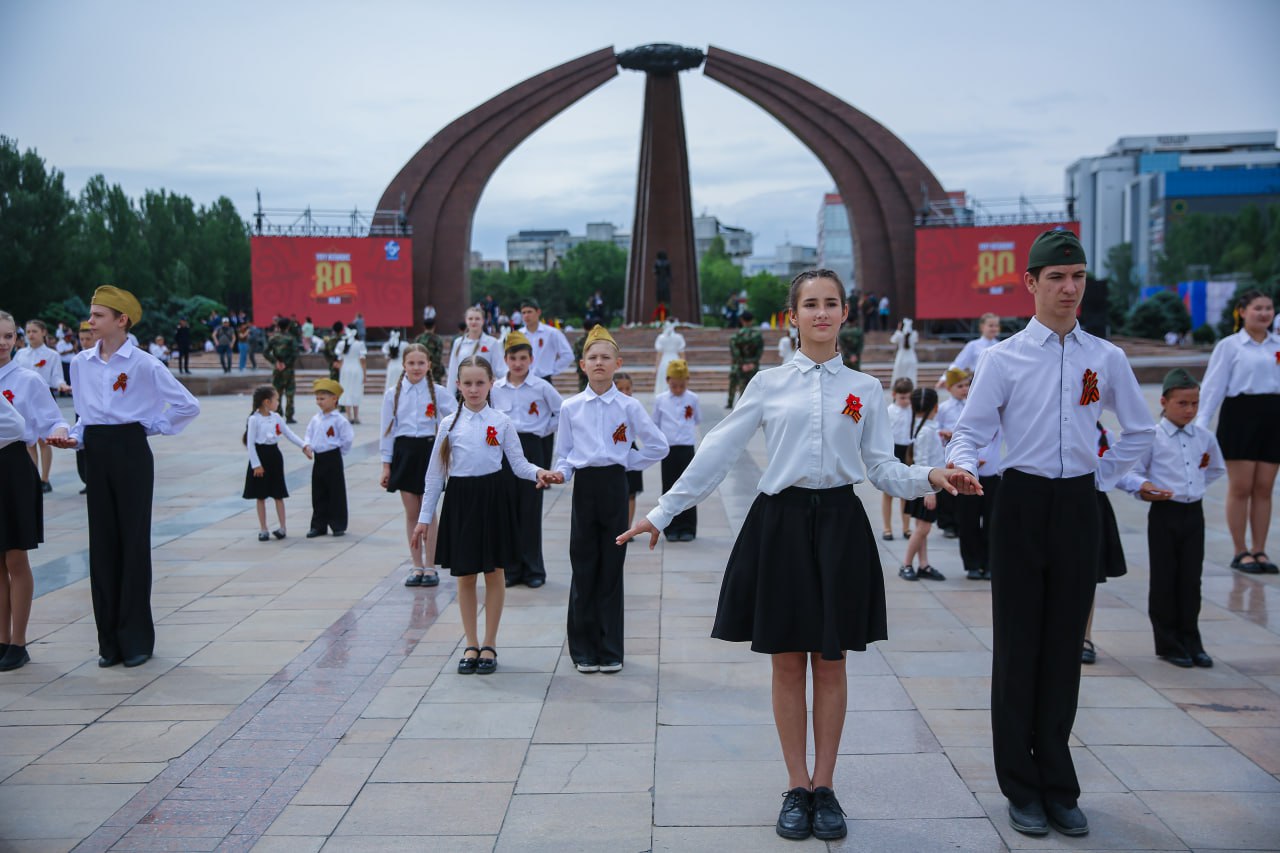 На Площади Победы их ожидали другие горожане и гости столицы. Там ветераны, мэр столицы и депутаты Бишкекского городского кенеша возложили цветы к Вечному огню. После гостей ожидала выставка военной техники и традиционная солдатская каша.