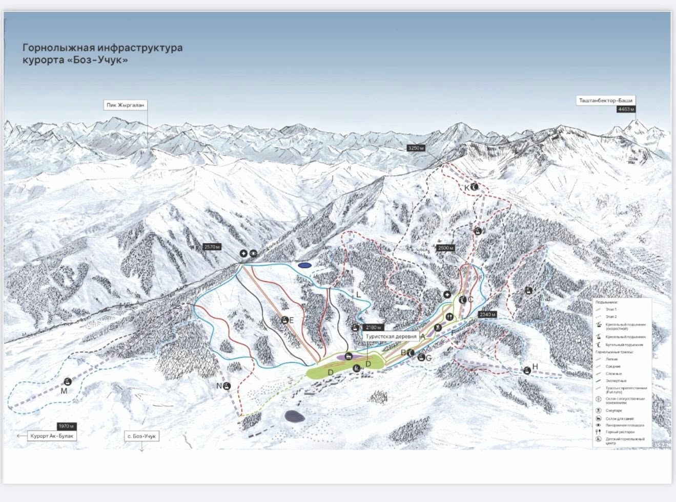Вторая фаза строительства — участок Ак-Булак — завершится в 2027 году, а третья фаза — Боз-Учук — в 2028 году. После объединения трасс всех трех гор курорт будет функционировать в полном объеме, а общая протяженность лыжных трасс составит 250 километров.