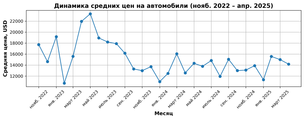 Начало 2023 года ознаменовалось беспрецедентным ростом цен на авто. Если в феврале 2023-го средняя цена составляла около $10,5 тысячи, то к маю она достигла исторического пика — примерно $23,3 тысячи. Рост более чем на 121 процент за три месяца — это не рыночная флуктуация, это взрыв.