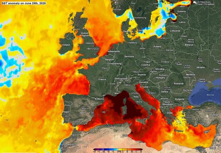 Средиземное море потеплело до аномальных значений. Температура воды в его отдельных районах в июне 2025 года превышала сезонную норму более чем на 5 градусов, сообщает Der Spiegel со ссылкой на службу спутникового мониторинга Земли Copernicus.