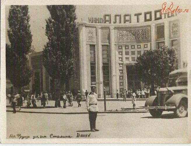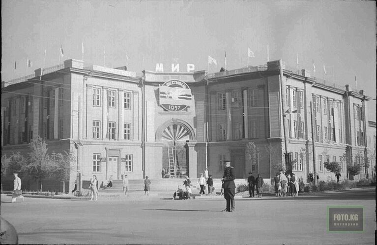 На фото перекресток улиц Тоголока Молдо — Фрунзе в 1957 году. В центре стоит инспектор ГАИ в тогдашней форме темно-синего цвета, в левом нижнем углу переходит дорогу джентльмен в модных тогда белом костюме и фуражке.