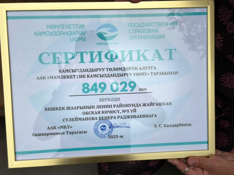 Все необходимые документы, включая акт пожарной службы, переданы в ГСО 16 июля, а 24 июля женщине выплачено полное страховое возмещение в размере 849 тысяч 29 сомов.