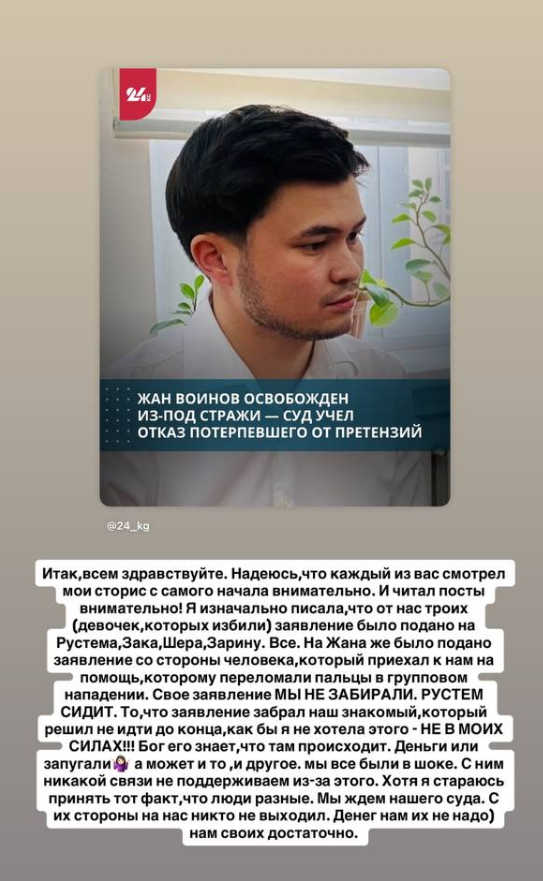 «Заявление подавал мой друг, который приехал к нам на помощь и которому сломали пальцы. Мы свое заявление не отзывали», — написала Алина.Она также добавила, что заявление забрал ее знакомый, который решил не доводить дело до конца. «Это не в моих силах. Бог знает, что там происходит — деньги или запугивание, а может, и то, и другое», — отметила Алина Жакыпова.
