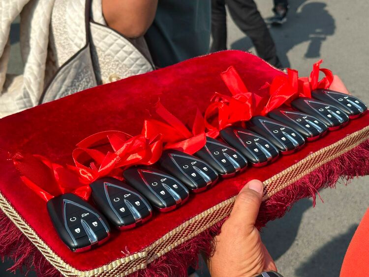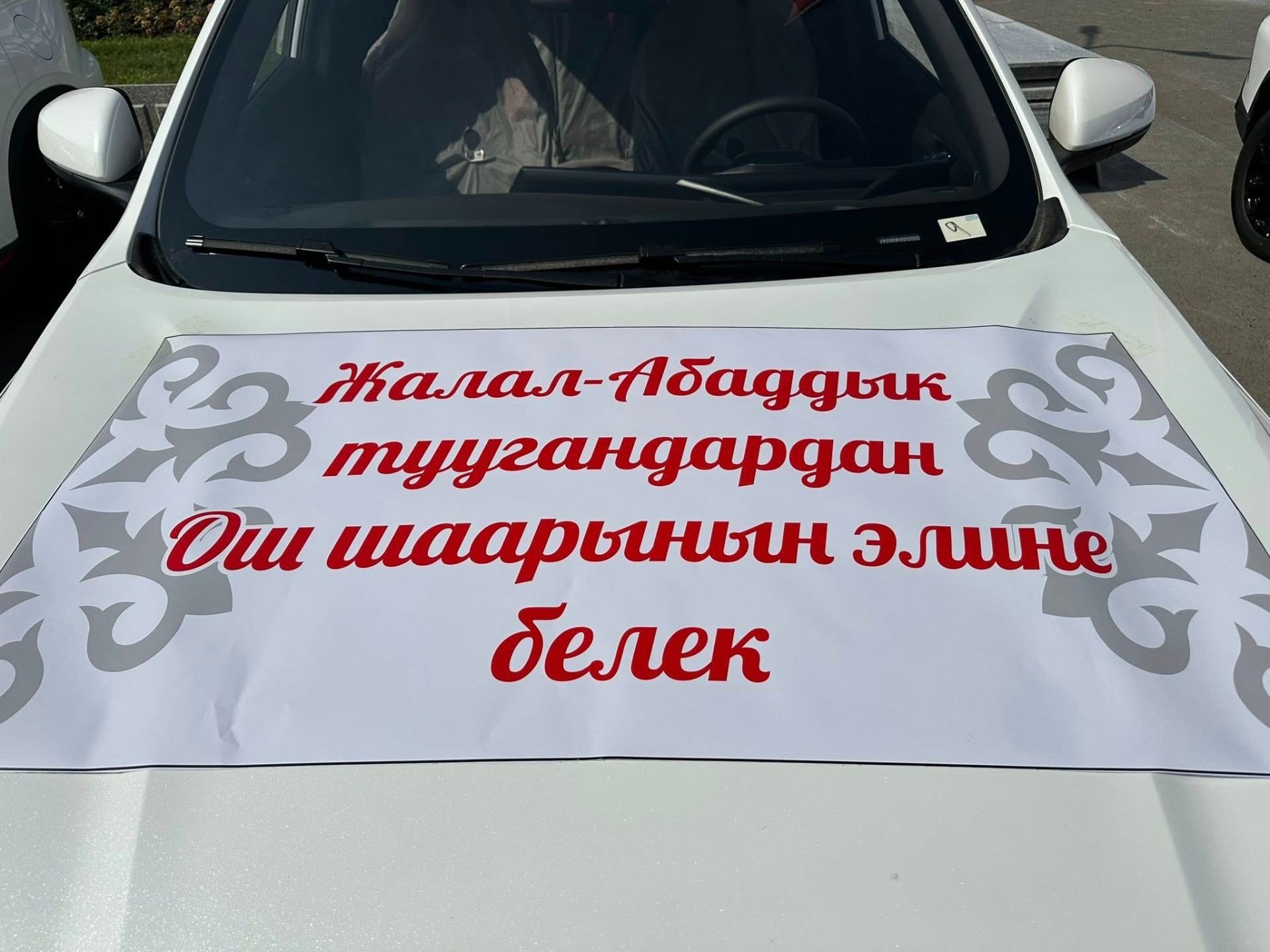 Асылбек Муратбеков заявил, что поддерживает работу, проводимую в городе Оше, и подарил электроавтомобили с надписью «Подарок от жителей Джалал-Абада жителям Оша», передав ключи мэру Женишбеку Токторбаеву.