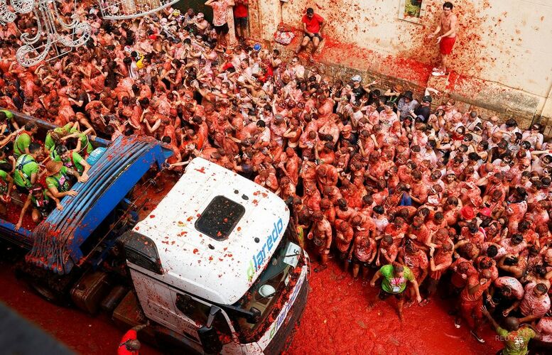 В испанском городе Буньоле прошел праздник «Томатина». Более 2 тысяч участников фестиваля на протяжении часа забрасывали друг друга 120 тоннами помидоров. «Битву» показывали по местному телевидению. На фестиваль приехали туристы со всего мира, передает El Pais. 2
