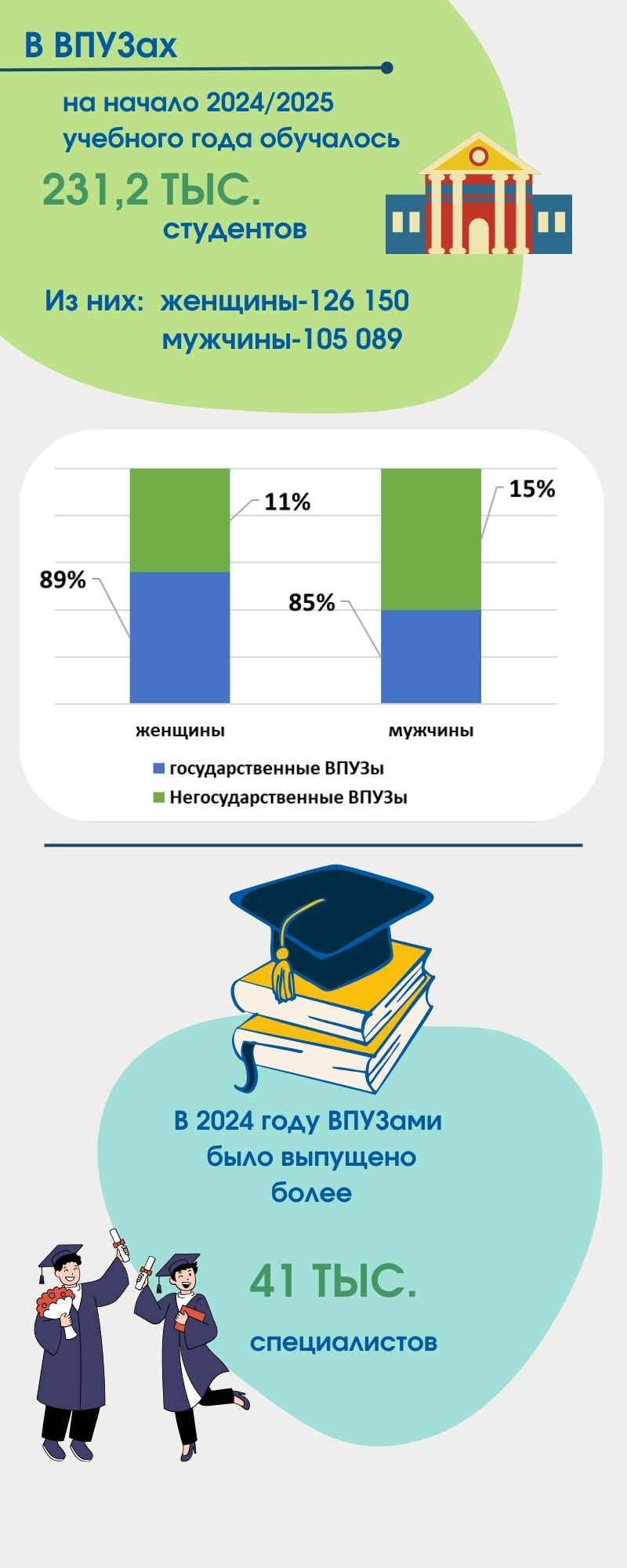 По его данным, в 2024 году вузы страны выпустили свыше 41 тысячи специалистов. Всего в республике действуют 57 высших учебных заведений, из которых 41 — государственные и 16 — негосударственные.